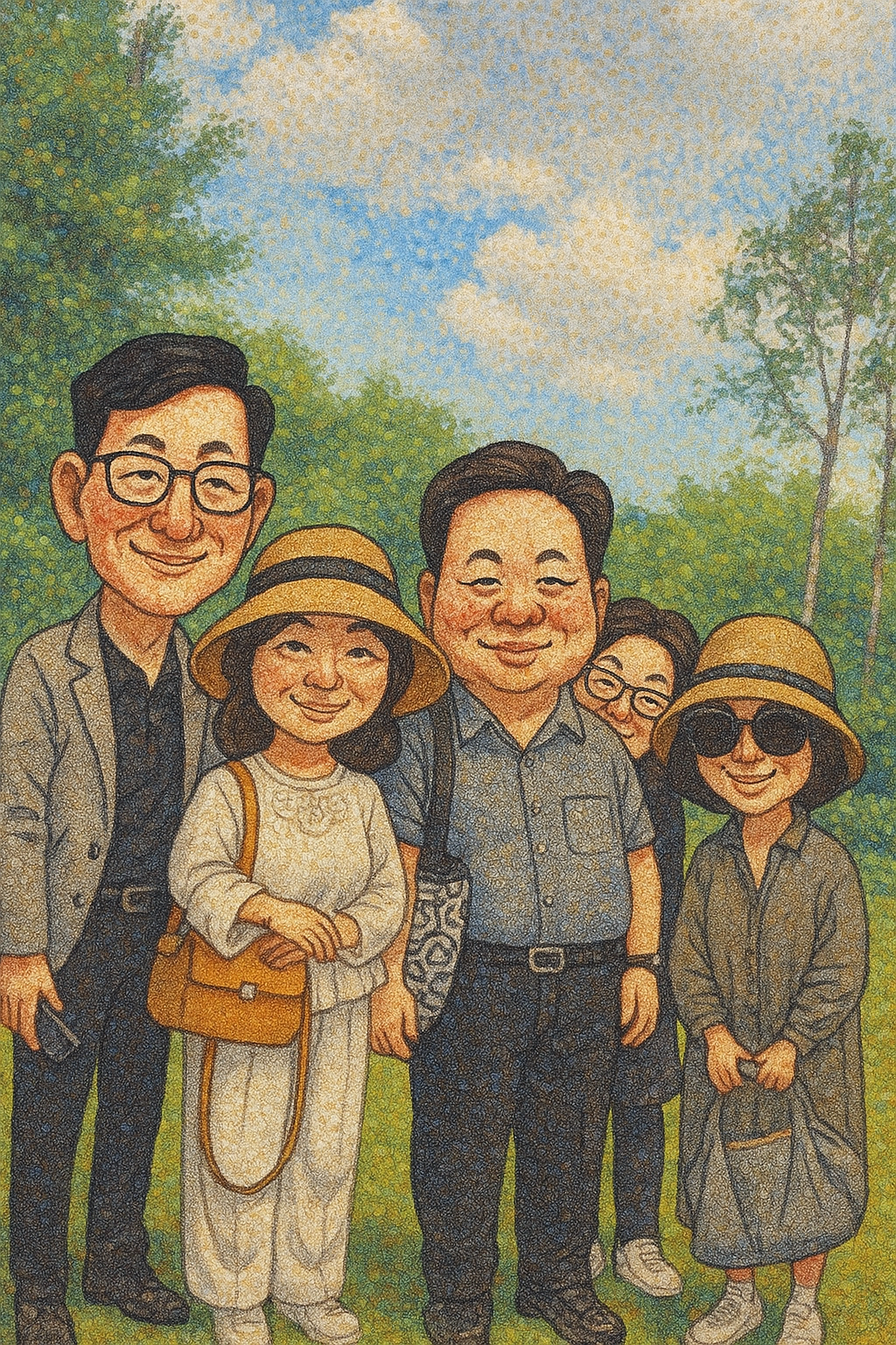Transformed My(family) pictures by Chat Gpt and Snapchat(AI) -점묘화, 커리컬쳐 등(그래픽스와 AI 기술의 결합)